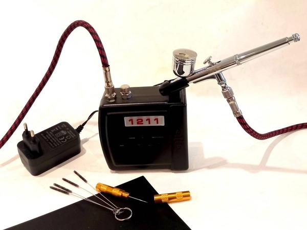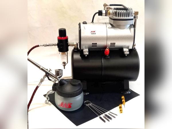Набор для аэрографии: - JAS1152 Аэрограф с комплектом сменных ёмкостей, игл и сопел; JAS1222 Компрессор , с регулятором давления, автоматика, JAS1402 Шланг, G1/8" х G1/8", 3 м, JAS1620 Набор "Ёршик" для очистки каналов аэрографа (краскопульта); JAS1574 Набор баночек для колеровки и хранения красок - 6 шт., JAS3534 Пипетка для колеровки, 3 мл.