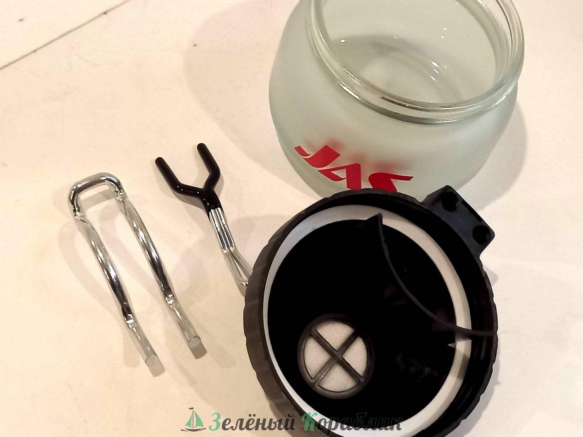 Очиститель для аэрографа, входящий в набор, используется не только для удаления остатков краски в аэрографах. Он может использоваться как подставка для аэрографа. Соответствующие приспособления входят в комплект.