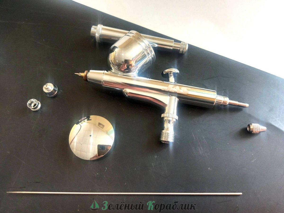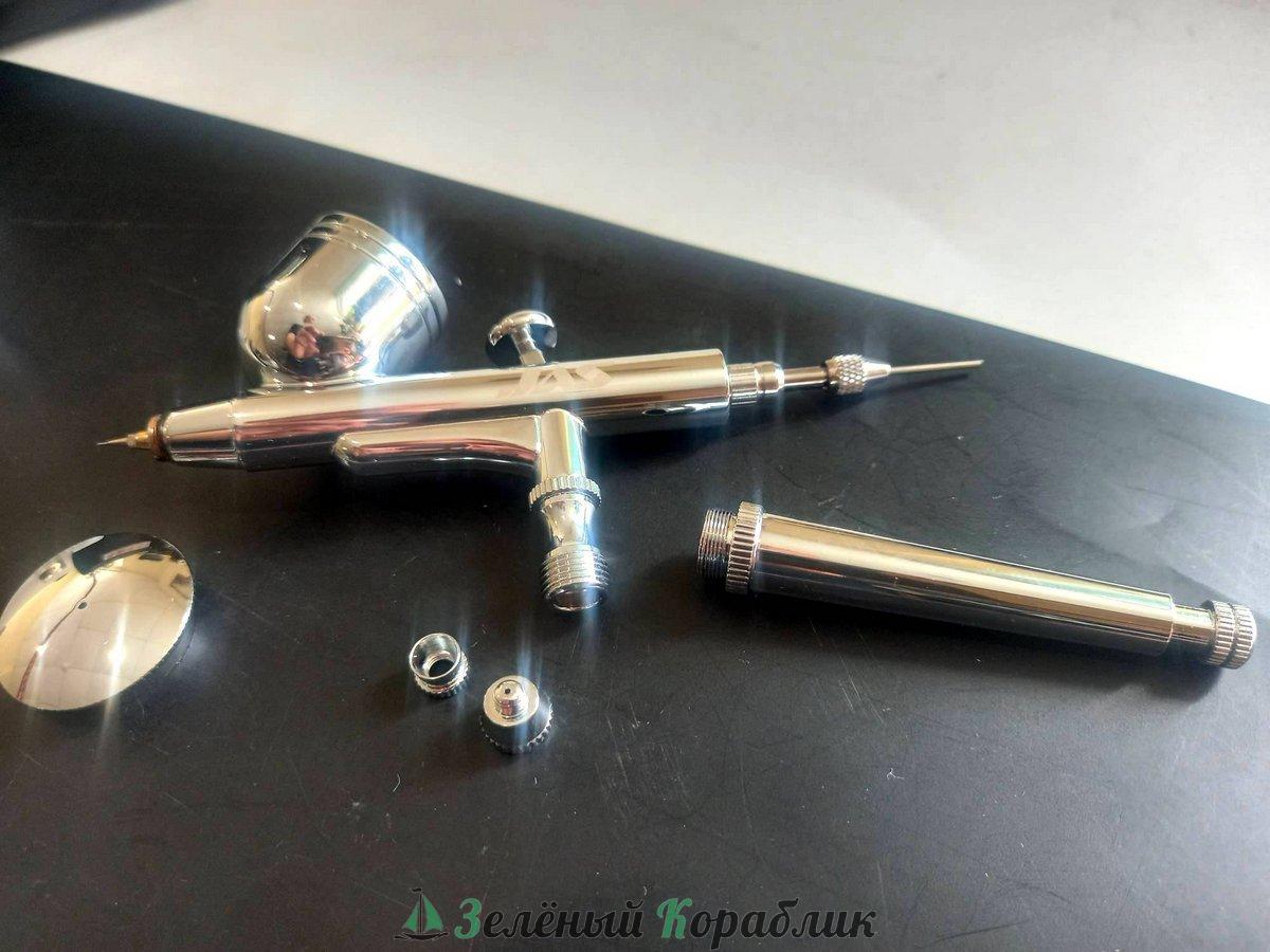 надёжный аэрограф 1113 со встроенной микро-ёмкостью. Она не требует откручивания, что удобно для быстрой промывки. В комплекте - запасное сопло диаметром 0.3 мм